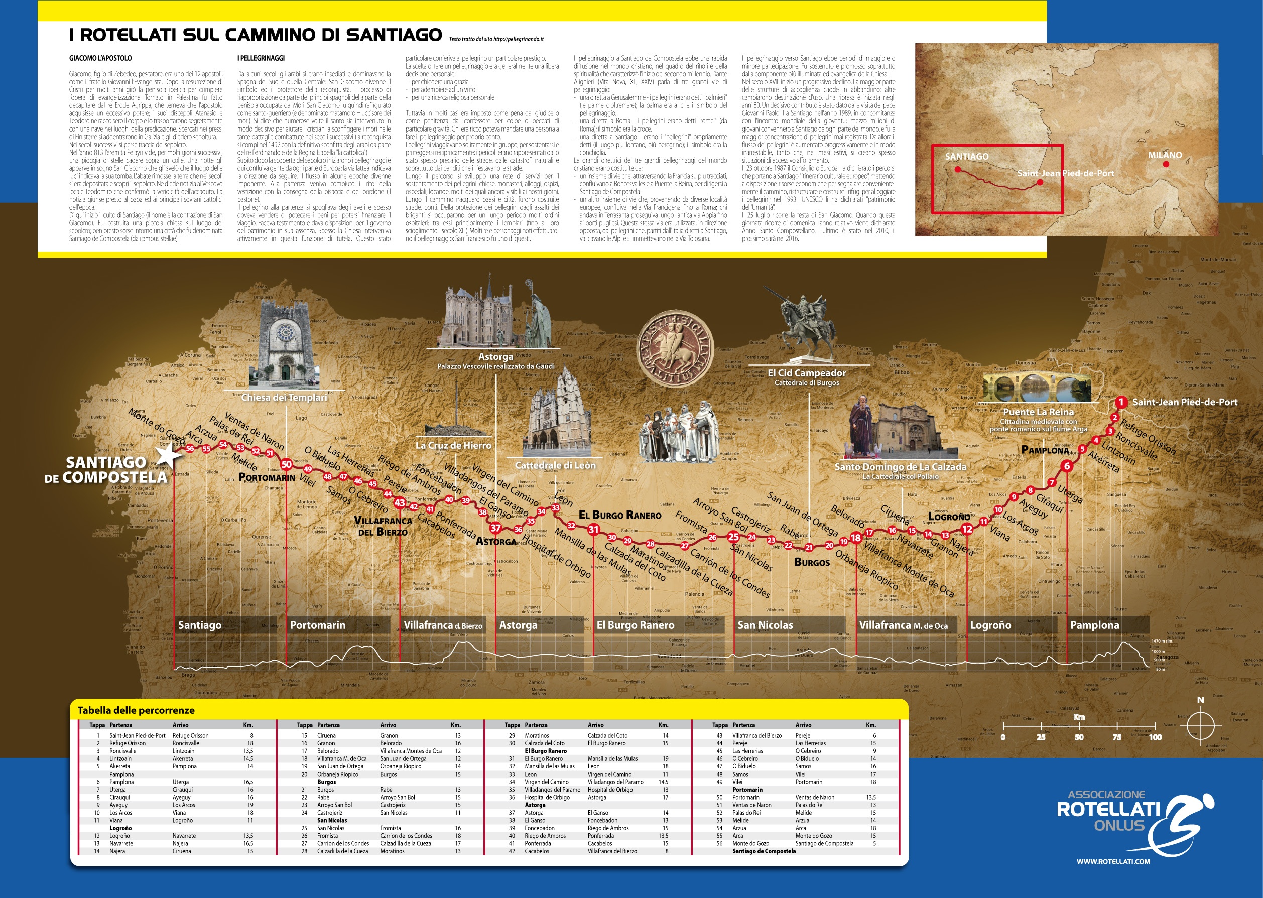 L’Associazione Rotellati Onlus ha un grande progetto da realizzare: raggiungere Santiago di Compostela! Il viaggio che avrà inizio ad Aprile 2015, attraverso 57 tappe vedrà impegnati Marco, Luigi e Pierpaolo dai Pirenei a Santiago di Compostela e si concluderà a Giugno 2015.